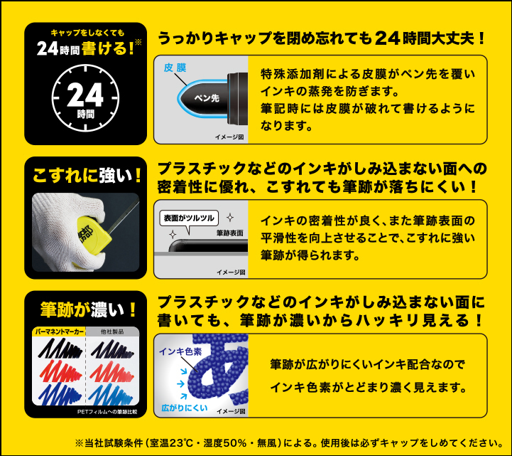 24時間キャップを外したままでも書けて筆跡が濃く、こすれにも強い油性マーカー!