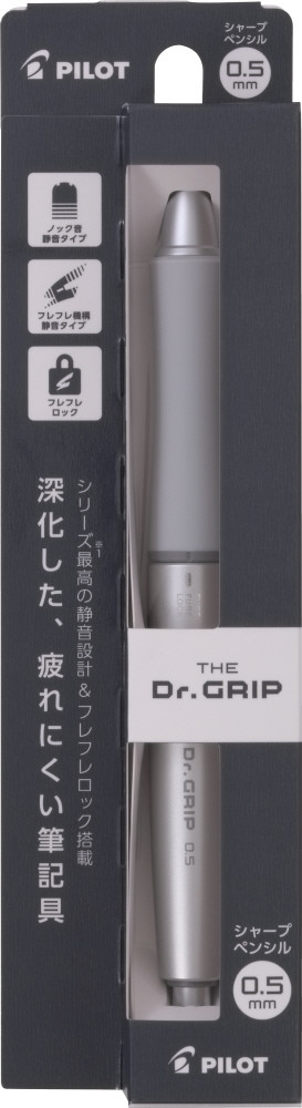 移動中の衝撃などで、フレフレ機構により芯が出てしまうことを防止する「フレフレロック」機構です。グリップ部分を回すことで「フレフレロック」のオン・オフの切り替えができます。ロックをオンにしたままでも、ノックでの芯の繰り出しは可能!携帯時にペンケース内やバッグの中が芯で汚れることを防ぎます。